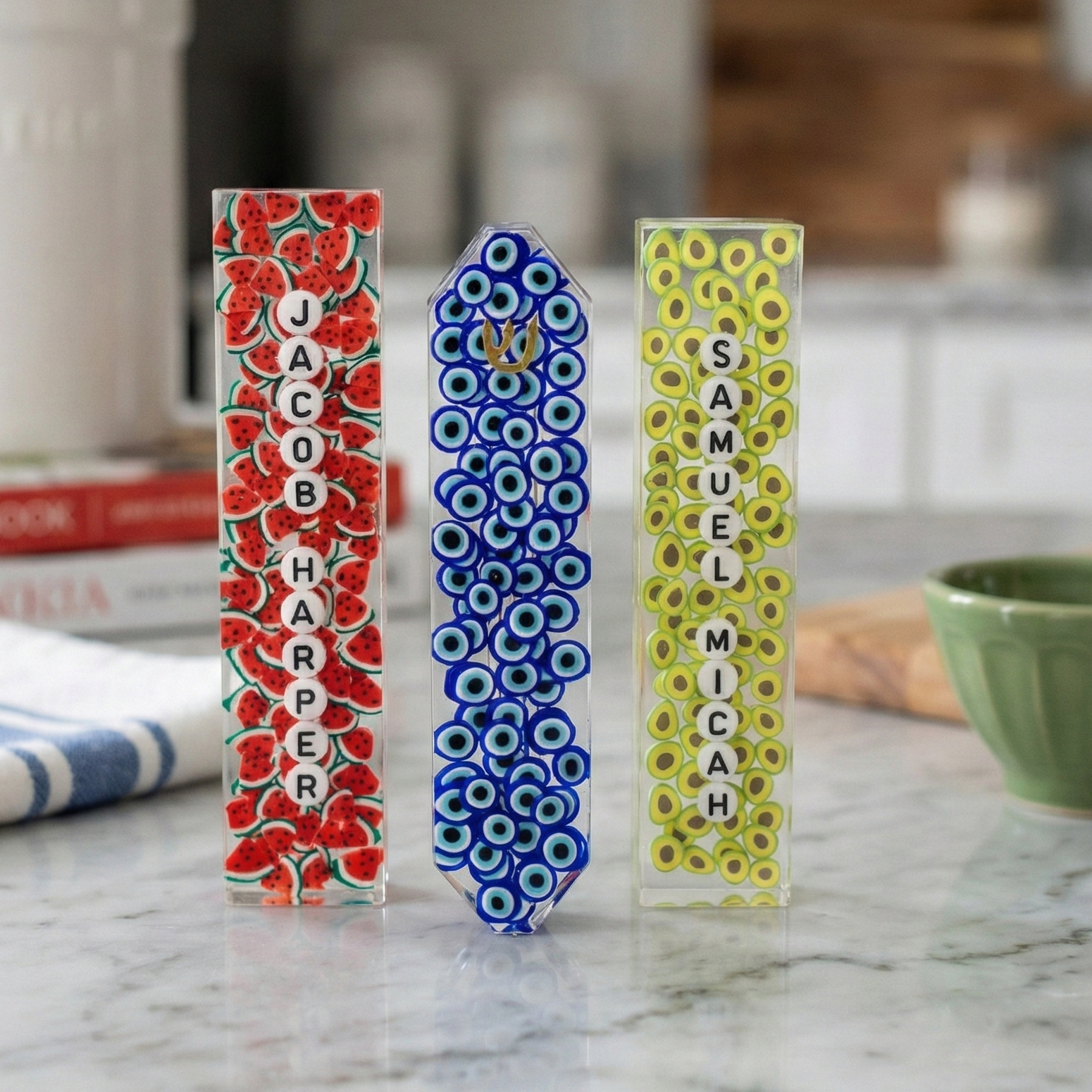 One of a kind, handmade resin mezuzah cases that will surely make a statement in your home and bring your doorframe to life! Filled with high-quality chunky pigmented glitter, this collection is holographic and will shimmer, shine and colour shift depending on the light.